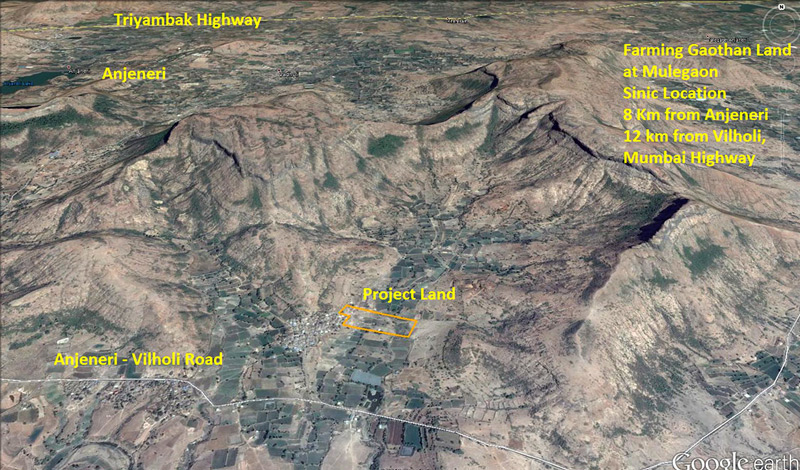 9.5 Acres land in Gaothan area of Mulegaon. 8 kilometers away from Anjaneri, trimbakeshwar Road and 12 kilometers from Vilholi, Mumbai Road.
